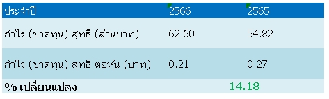 In 2023, the company's net profit is 62.59 million baht, an increase of 7.77 million baht or 14.17% from the net profit of 54.82 million baht in the same period last year. 573.06 million baht increased by 120.76 million baht or 26.70% to 452.30 million baht from the same period last year as a result of increased income in all major business categories. The details are as follows: