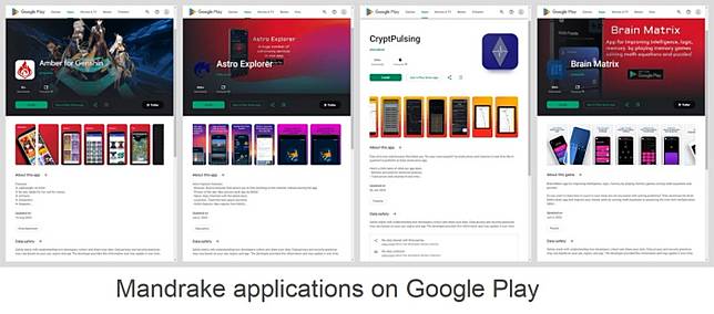 The five apps that contain Mandrake spyware on Google Play were launched as a Wi-Fi file sharing app, an astronomy service app, the Amber app for the Genshin game, and a cryptocurrency app. The apps that contain puzzle games as of July 2024, according to VirusTotal, none of the apps have been detected as malware by any vendor.