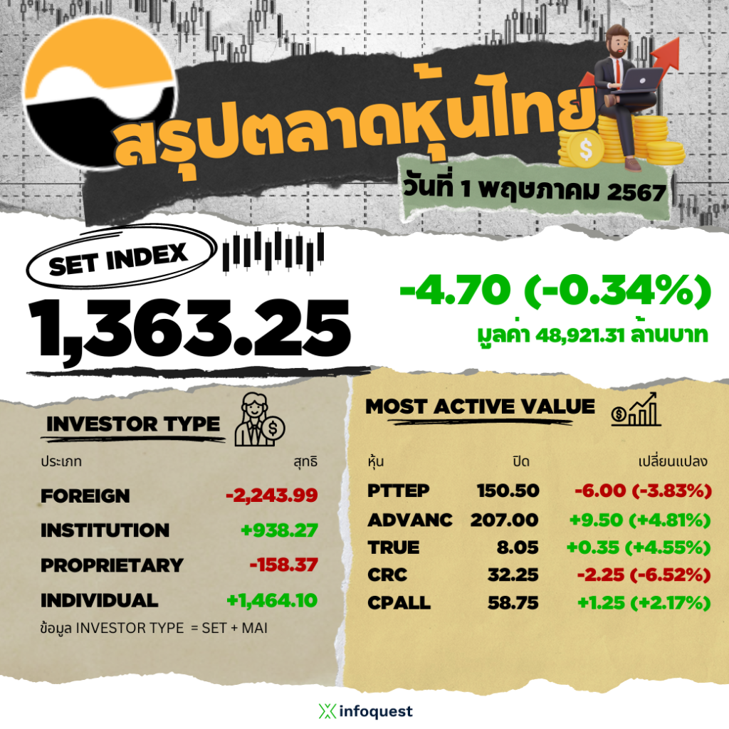 The stock market closed today at 1,363.25 points, down 4.70 points (-0.34%), with a trading value of 48,883.09 million baht.