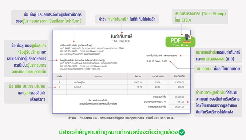 At the top is an ETDA approved timestamp and at the bottom is a time stamp. Tax invoices are prepared electronically and sent to the Revenue Department by electronic means. But there is no word Website digitally by Or there may be an “e-mail tax invoice” logo next to it, which means it is an e-mail tax invoice.